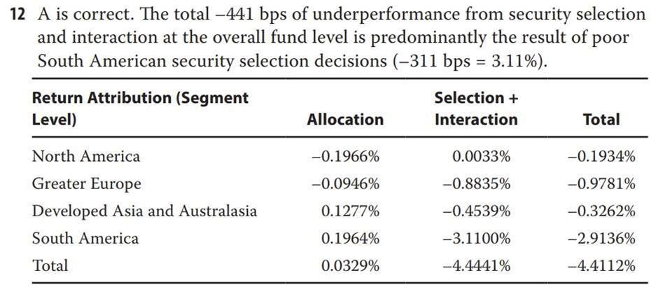 第35章课后题第12题。本题我选择了正确的答案。不过,答案讲解中,把交叉项(interaction)也放入了证券选择(security selection)带来的超额收益中。这一做法的确是符合2020年2级课程第47章第2节“对增加值的成分分解(decomposition of added-value)”之做法的,但其是否依然适合于3级课程呢?也就是说,3级中的security selection究竟是只包括(Rp-Rb)(Wb),还是需要包括(Rp-Rb)(Wp)呢?谢谢!