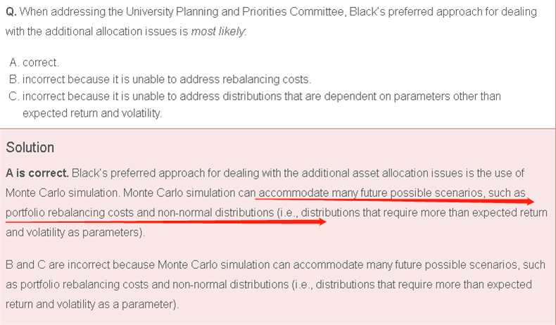 已回答老师好,官网题。这个答案不太正确吧?按照上课老纪说的蒙特卡洛,就是你模拟什么出什么结果,模拟的是正态分布出来的就是正态分布;模拟的是偏态分布出来的就是偏态分布。它不会出现你模拟的是正态分布但是出来的结果是偏态分布的情况啊。(相关的疑问我写在了截图里面),谢谢!