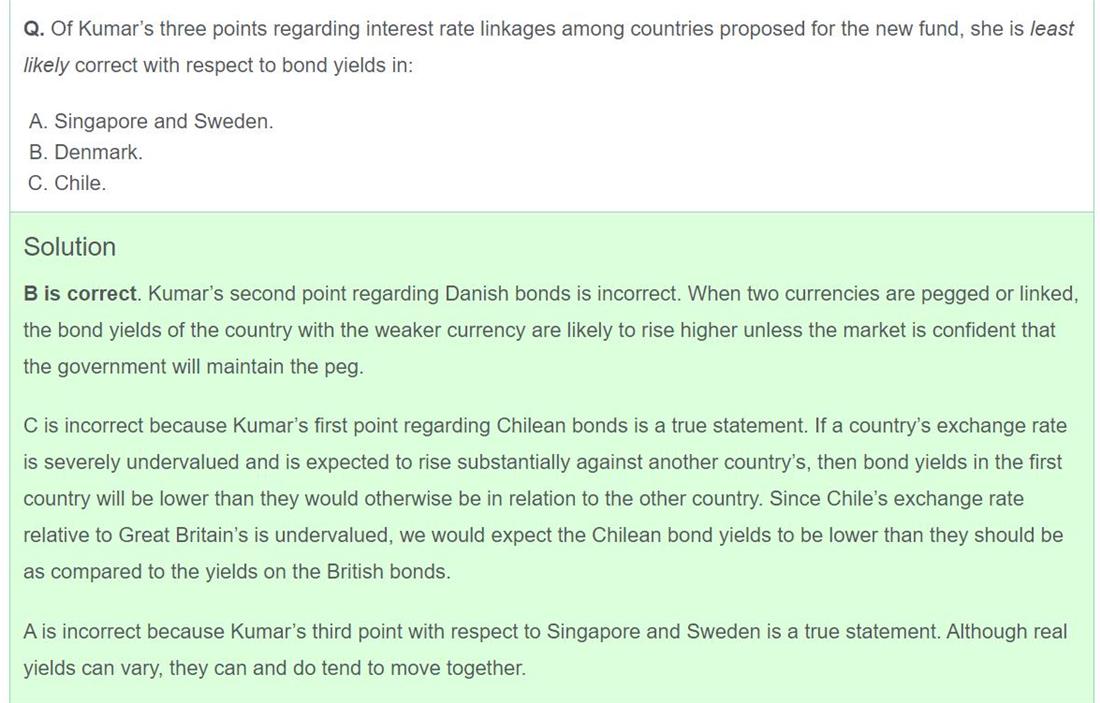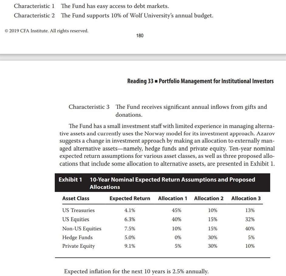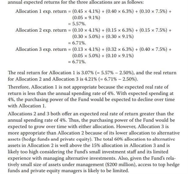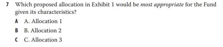 第33章课后题第7题。本题我原以为是一道定性题,但没想到依然是一道定量题。文章中说到,基金之前采用的是挪威模式,另类资产较少。而Azarov建议配置一些另类资产。题目中“根据其基金特征(given its characteristics)”令我参考了之前的特征部分(涉及第6题),这些特征反映出该基金具有较高的风险容忍度。有鉴于此,我选择了另类资产(高风险)比率最高的配置方案(B选项)。但正确答案是C选项。正确答案的思路是先计算各配置方案的加权平均预期回报率,先排除掉一个回报率较低的选项(A)。其在选项B和C之间选择C的理由,却正是因为选项C对应的资产配置方案中,另类资产比率较低。这令我感到困惑不解——因为这样一来,正确答案的思路就违背了题目中“根据其基金特征(风险容忍度高)”进行选择的本意。应该如何理解正确答案呢?谢谢!