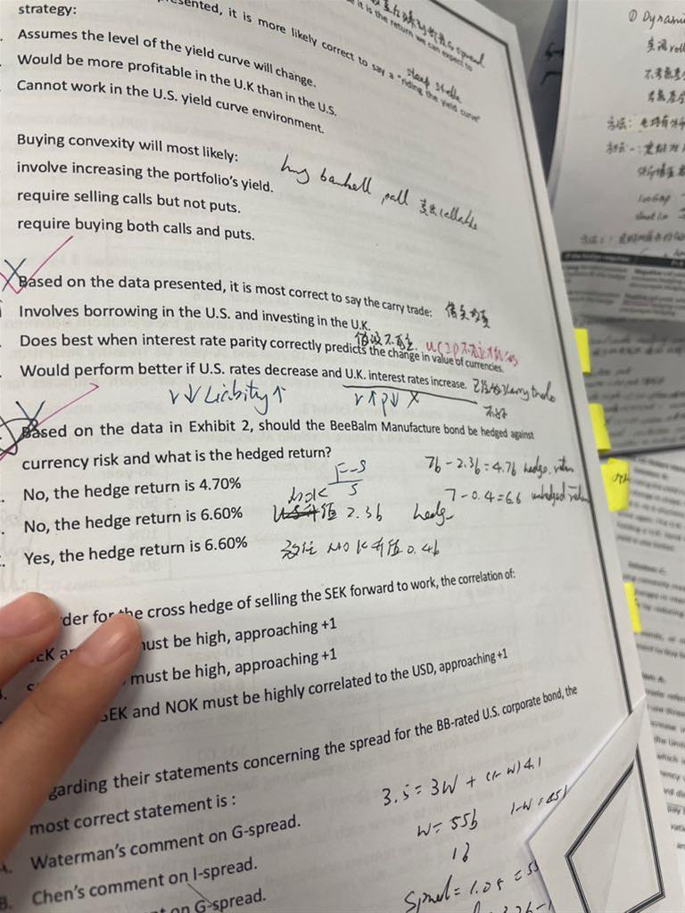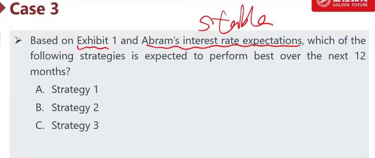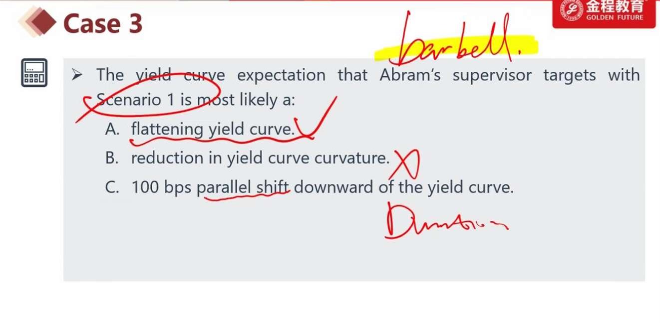你好,这个题的选项C不对还是不太能理解,请看三级冲刺笔记第34页关于downward parallel shift的解读,收益率曲线平行向下的时候,如果duration不变,那么只能通过增加凸性来增加收益,也就是long barbell short bullet. 无论如何这个C选项都应该是对的啊,要不知识点就乱了。。