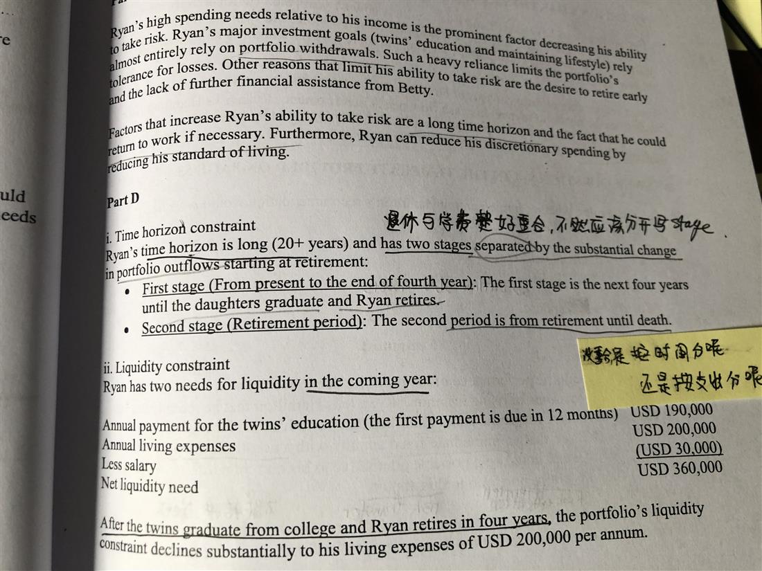 已回答老师您好, 这道题正好是女儿的教育费结束和退休时点正好重合, 我能说出two-stage time horizon(from now to retirement, from retirement until death). 但是如果教育经费和退休时点不重合, 我怎么去回答他们的time horizon呢, 到底是以重要时点划分呢, 还是按重大消费划分time horizon呢?谢谢