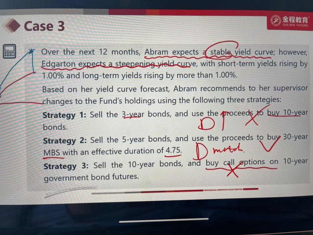 已回答老师,17题是基于Abram’s interest rate expectation(stable yield curve), 所以此时题目里的strategy 1不行不是因为Duration不match吧? 因为stable yield curve时Duration不需要去match(不用构建immunization), 这里不能选A是因为不符合题目要求(因为题目要求duration match)