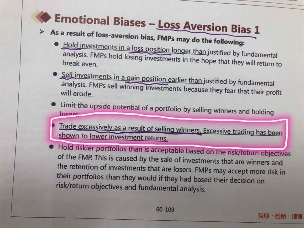老师,关于loss aversion bias会导致的后果,基础课上纪慧诚老师说,交易量既可能上升↑也可能下降↓。但是PPT第60页里的一句话,excessive trading has been shown to lower investment returns. 这句怎么理解? lower investment return不应该是导致交易量下降吗?