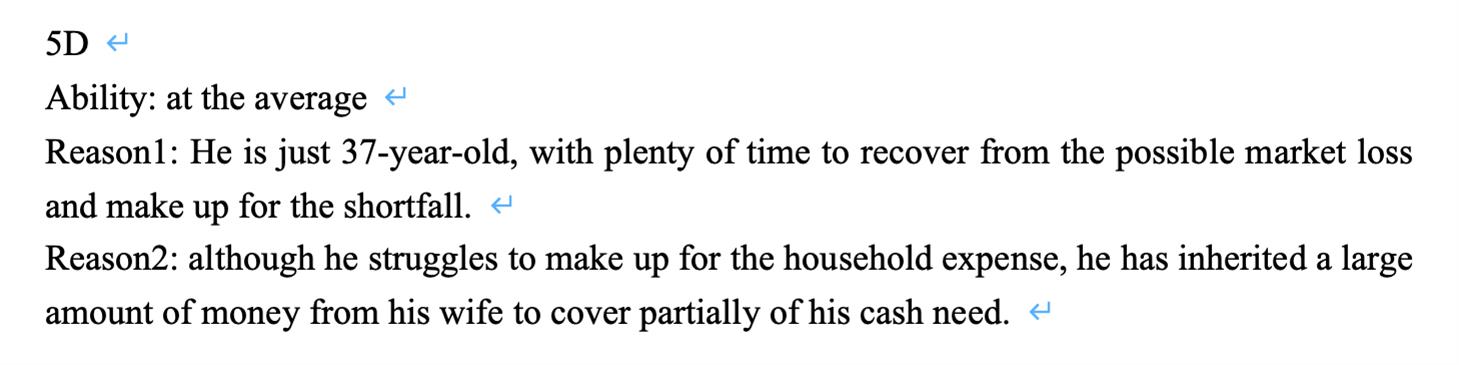 模考2的第五大问 C问 这里写sell and lease back his residence是否可以呢?和refinance the mortgage on the residence有什么不同? D问 我觉得这里的risk ability是at the average 虽然如答案所说,他的资产规模比较小收入和savings也比较低,但是有两点能够提高risk tolerance,一个是他很年轻投资时间比较长,一个是他继承了一笔比较大的遗产。综合来说,应该是属于一个平均值吧?
