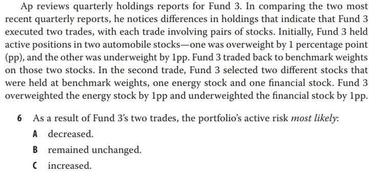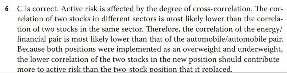 已回答第25章课后题第6题。文章中说到,基金3的经理执行了两组配对交易。第一组配对交易将同行业个股之间的积极权重减少了2pp,第二组配对交易将异行业个股之间的积极权重增加了2pp。题目询问基金3的积极风险总量有何变化。我的选择是B(不变),因为我根据笔记,认为积极风险由两部分组成,一部分是行业风险,另一部分是个股风险(active share,又称idiosyncratic risk),两组配对交易对风险的影响应该是互相抵消的。而正确答案是C(上升)。正确答案认为积极风险受到个股间相关系数的影响,同行业个股间相关系数较高,异行业个股间相关系数较低,两组配对交易的总体影响是个股间相关系数下降,这将导致积极风险上升。我对此感到困惑,因笔记中的积极风险公式并不包括相关系数或协方差项。虽然在本章风险预算部分,投资组合积极回报方差(active variance)计算公式中有协方差项,但这也无法解释,为何个股间相关系数会和积极风险呈【负相关】。望老师予以解释,谢谢。