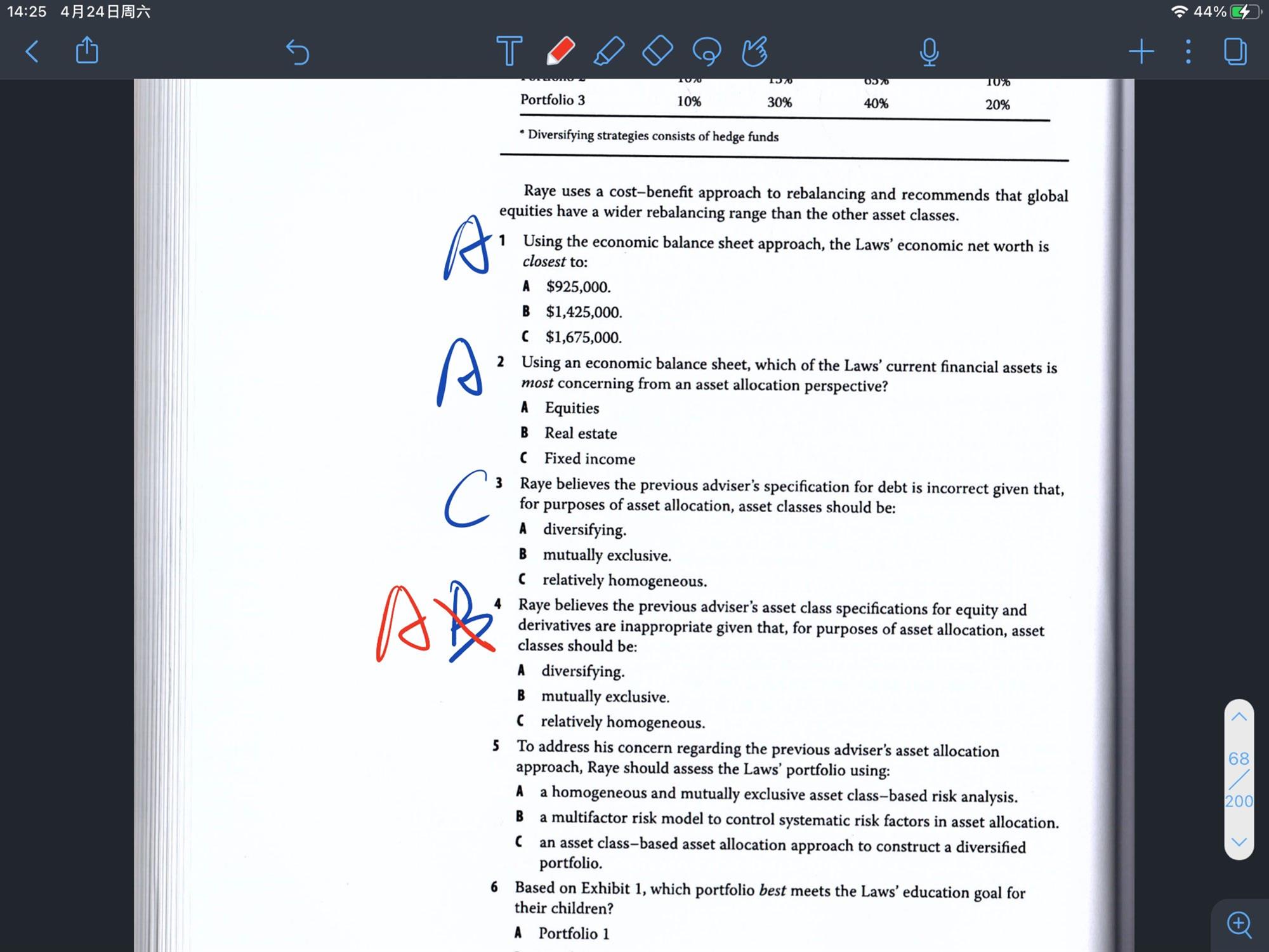 老师,第四题为什么不选B,equity和derivatives里都有equity,不是没有mutually exclusive吗