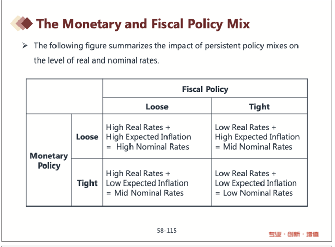 老师,关于这个mix of monetary policy and fiscal policy我有些搞混了。 (1)按照第一张图里的表格,如果是loose monetary + loose fiscal,应该得出的结论是high nominal rates,请问老师这个high nominal rates是短期的名义利率还是长期的名义利率? (2)按照老师在yield curve这张ppt讲的,stimulative monetary + stimulative fiscal,会使得yield curve短期利率下降,长期利率上升。那么这个和上面那个表里的结论不太一样,请老师解释一下 (3)loose policy = stimulative policy, tight = restrictive,我这样理解是对的吗