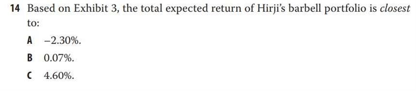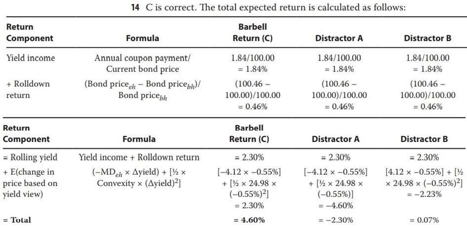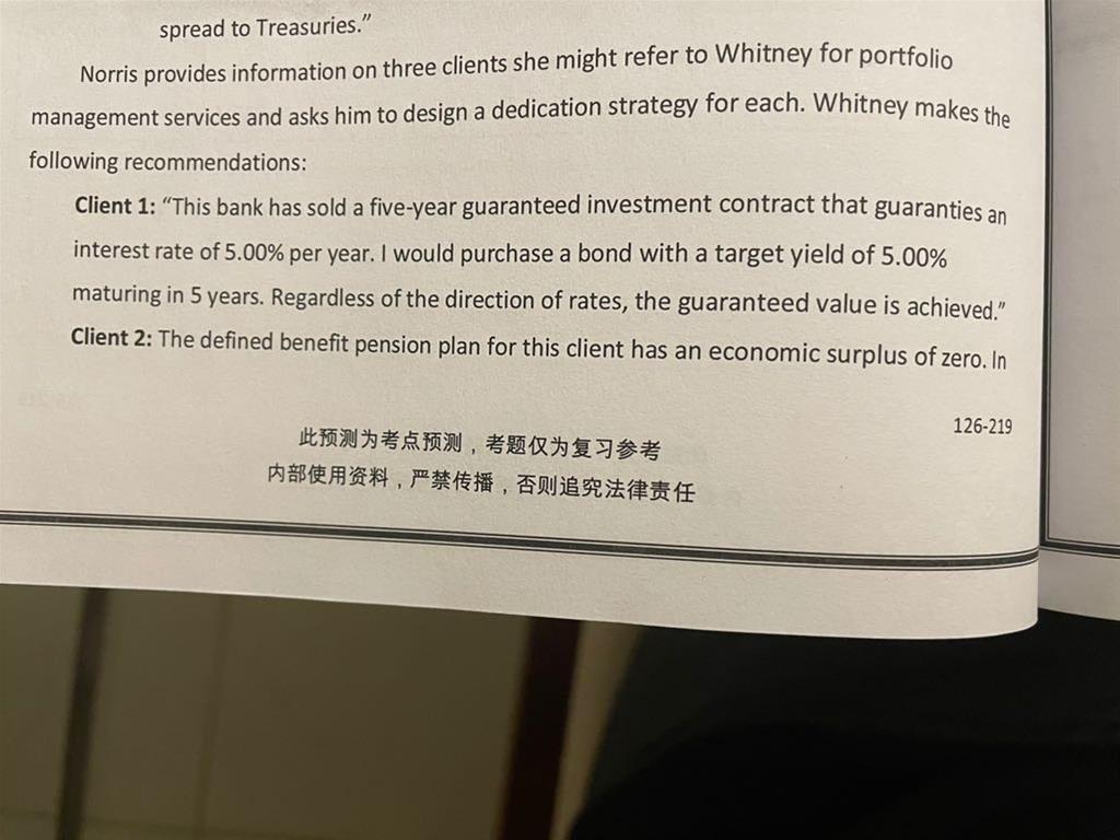 已回答第20章课后题第14题。根据第18章课后题的经验,若投资组合中包含期权,则应该使用有效久期(Effdur);若投资组合中不包含期权,则应该使用修正后久期(Moddur)。然而文章中并没有给出这个英国机构投资者的投资组合中,是否包含期权的信息。我分别计算了使用有效久期和修正后久期的总预期回报率,前者为4.60%,后者为5.04%,进而选择了正确的选项C。但在考试中遇到这种情况的话,应该如何判断出需要使用哪个久期(以节省时间)呢?谢谢!
