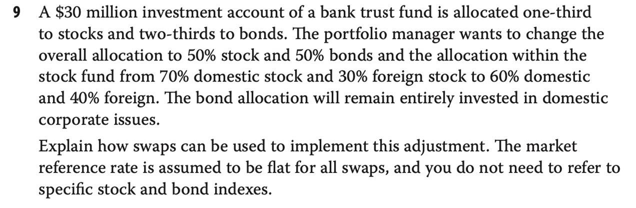 原版书reading 16的第332页,对于通过swap去调整组合中的权益和bonds的比例,在原版书的例题中,是需要将债券全部换为floating,再支付floating转换为对应需要的equity的收益,但是在reading 16的课后题目的第9题,答案中又是直接将bonds的收益通swap换成对应需要的equity 收益,到底什么时候需要通过floating转化一下?