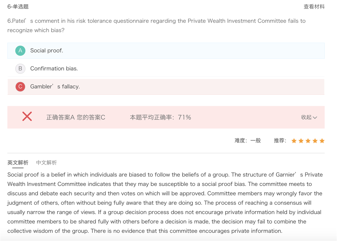 为什么第六题不选gambler's fallacy?文中已经提到patel 's risk tolerance would increase significantly if he knew that an investment had the unanimous support of Garner's Private Wealth Investment Committee. 这句话满足social proof 和confirmation bias. 但是没有提过gambler's fallacy. 而题目问的是patel's questionnaire fails to recognize which bias. fails to.