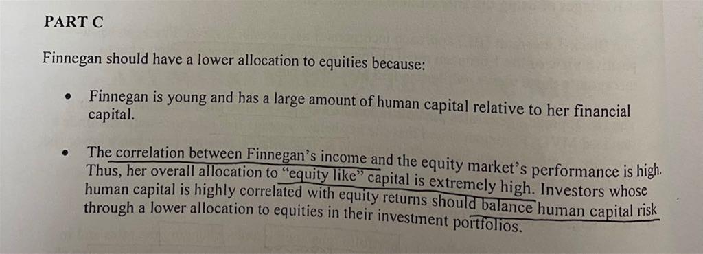 练习册中册P96 C问 没有看懂答案说的第一点,……is young and has a large amount of.... 和要减少equity allocation有什么关系吗? 除了答案里写的 human capital & financial capital 相关性太高这一点以外,我还写了股票权重过高会导致over-concentration,这可以算是不同的两点吗?