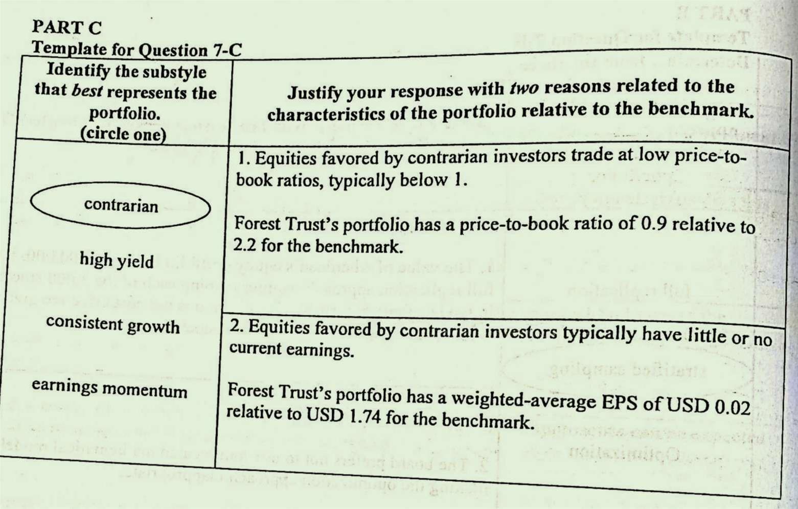 老师,请问这个题目的两点原因只能写P/B和EPS么?long term earnings growth rate和average market captilization of stocks也和benchmark差很多,能作为判断是contrarian的理由么?