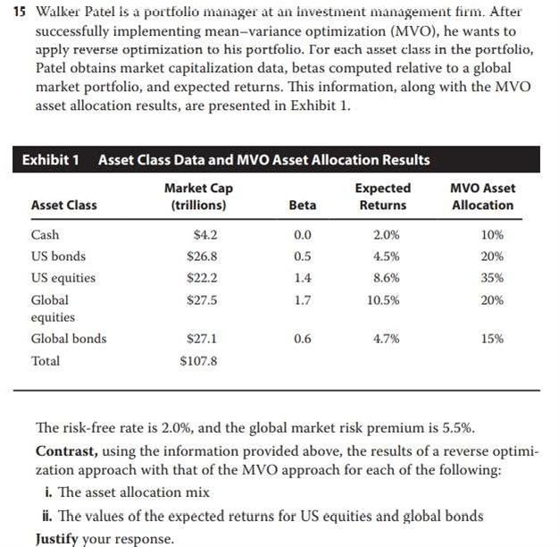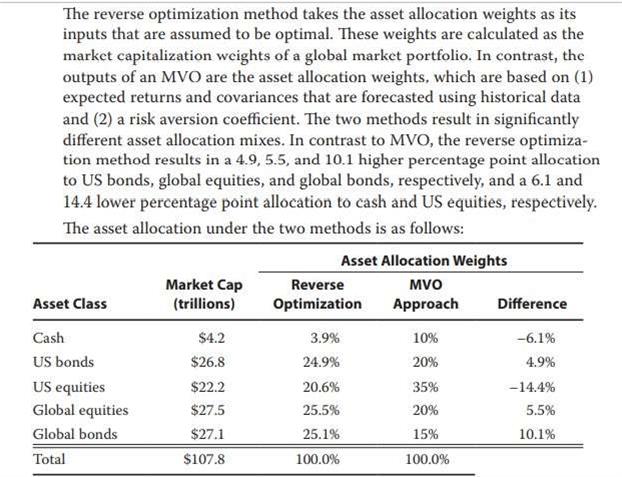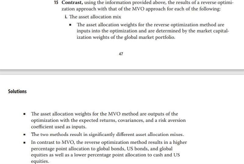 第13章课后题第15题。题目中要求用反向优化(reversal optimization)方法求出各资产的最优权重,但题目并未给出市场和投资者个人的避险情绪系数λ。答案中给出的数字仅是根据各资产市值占总市值比重算出的隐含权重(implied weight),个人认为它并不算是最优权重(optimal weight)。此外,使用表1中各资产风险系数β、市场风险溢价5.5%和无风险利率2%算出的各资产预期回报率分别为cash 2.00%,US bonds 4.75%,US equities 9.7%,Global equities 11.35%,Global bonds 5.3%,这和题目中表1所给出的各资产预期回报率并不相同,分别有cash +0.00%,US bonds +0.25%,US equities +1.10%,Global equities +0.85%,Global bonds +0.60%的差距。这一差距来自何处呢?是否因为表1中给出的预期回报率实际上是效用函数的结果(效用值),扣除了风险所致的效用损失?谢谢!