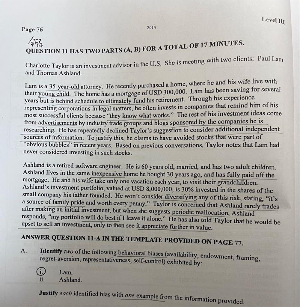 练习册中册P24 2014年Q11的A问 Lam 我觉得他还有self- control bias 因为第二段的第二行:He has been saving for several years but.... The evidence indicates that sometimes he may choose to consume rather than saving, therefore he misses out the predetermined plan of funding his retirement. 另外,availability和representative有什么区别吗? 除了availability有一个关键词可以是advertisement之外。正因为感觉两个特别相像,所以我没有写representative而是写了self-control
