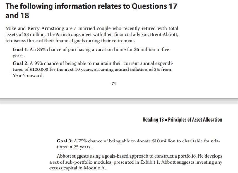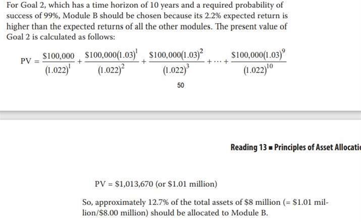 第13章课后题第18题。题目要求计算每种资产占总投资的最优权重。根据目标数据和表格中的最小预期回报率,我对目标1(Module C)和目标3(Module D)的资产及权重计算正确,但对目标2(Module B)的资产及权重计算错误。 在使用科学计算器时,目标2中给出的通胀率数据应被用于计算FV,然后再使用10年期99%成功率对应的最小预期回报率最高值(Module B:2.2%)返回计算PV。在科学计算器中先输入N=10,I/Y=3%,PV=0,PMT=100000,计算出FV=(1146387.93),再将其除以1.03(因为通胀在第二年才开始发生,所以需要扣除一年的通胀率)得FV=(1112997.99)。之后,用最小预期回报率最高值2.2%=I/Y,PMT=0,N=10反推PV=895334.71,但这个数值和答案上所说的1013670并不一致。请问我在使用科学计算器的过程中,出现了什么错误?正确的流程应该是怎样的?谢谢!
