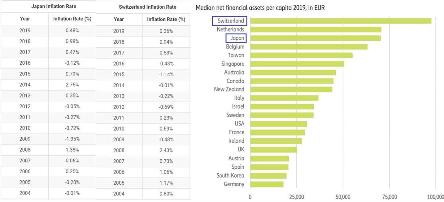 按照网课的内容,相较于高速通胀,通缩对经济造成的影响更为严重。但我感觉并非如此。可以参考现实中的例子:日本和瑞士是低通胀国家,自1990年代以来,这两个国家有着负利率和极低的通胀率。但这并不妨碍日本人和瑞士人拥有世界前十水准的人均金融资产储备(参见图1)。但另一方面,委内瑞拉和津巴布韦则是近20年来恶性通胀的典型代表国家,其结果就是国民的财富被洗劫一空,变得一贫如洗(参见图2、图3)。相较而言,是日本、瑞士的国民生活水平高,还是委内瑞拉、津巴布韦的国民生活水平高呢?显然是前者吧。所以,我认为恶性通胀,而非通缩,会给国内经济带来更大的负面效果。