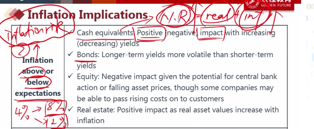 已回答老师你好, 如图,在inflation 超出预期时,现金及等价物的表述那里有些疑惑。 为何是positive impact with increasing yield? inflation高于预期,现金及等价物的价值下降了呀,这样就应该属于negative impact 了, 望老师指点。