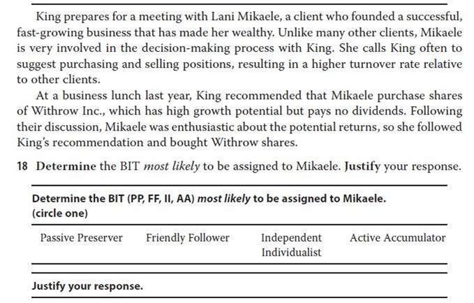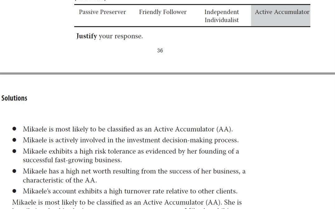 第9章第18题。客户Mikaele(1)深度参与到决策流程中去,作出独立的投资判断,而不是等着分析师的投资建议;(2)她具有较高的风险容忍程度。这两点说明她可能是AA型或II型客户,而不是FF型或PP型客户。正确答案表明她是AA型客户,但文中并未说到Mikaele“极为自信”。请问,文章中的哪些信息将AA型客户与II型客户区分开来,表明Mikaele是AA型客户,而不是II型客户?谢谢!