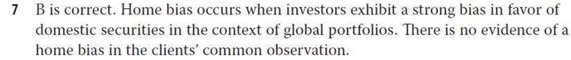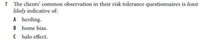 已回答第9章课后题第7题。该题问到3个客户“最不可能共同有”的一种偏向性。正确答案是home bias(家国情怀偏向)。的确,虽然Johnson有home bias,其他两人并没有明显的home bias,但也没有证据表明其他两人就一定是专注于投资外国证券。另一方面,我的选择是halo effect(光环效应)。它属于representativeness bias(代表性偏差)。而Perez的偏差是hindsight、framing、regret aversion,Johnson的偏差是illusion of control、overconfidence,Patel的偏差是endowment、loss aversion、status quo。也就是3个客户都没有representativeness bias。但3位客户都多少会有部分从众心理,希望他人的意见能够为自己提供一些帮助。