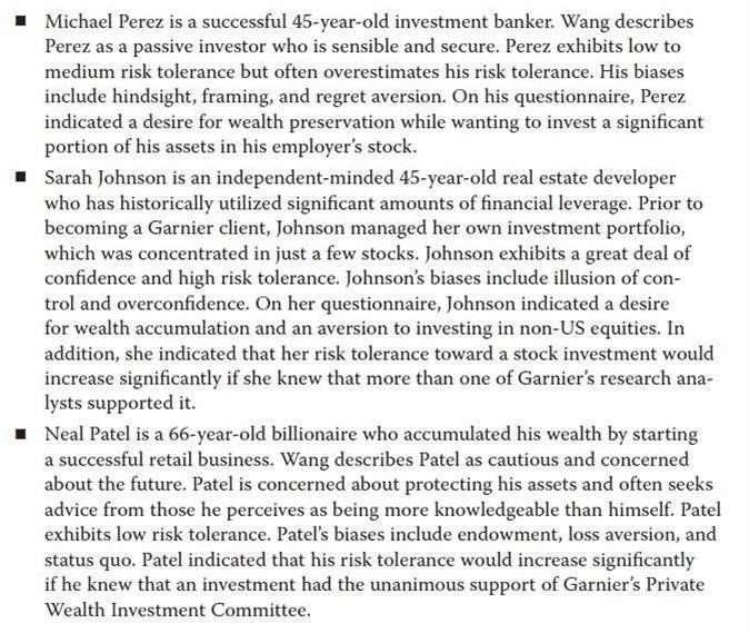 第9章课后题第2题。文章中给出了对3位客户的背景信息描述。从文章中的信息可以推断出,依照Pompian分类法,Perez和Patel属于PP型客户(风险容忍度较低,较为谨慎),Johnson属于AA型客户或II型客户(自信但投资组合不够分散化)。如果Johnson属于AA型客户,那么3位客户都更偏向于emotional bias,也就是传统问卷调查不适合任何一个客户。正确答案给出的是Perez适合传统问卷调查,但这个答案也就说明Perez不属于PP型客户了。莫非Perez属于FF型客户(因为他将自己较大的一部分资产投入到本公司的股票中去)?此外,尽管Patel已经是一个大富翁(billionaire),但他却依然有着较低的风险容忍度,这是否说明风险容忍度与一个人的财富水准并不完全相关,或Patel本身有着较强的Loss-aversion?
