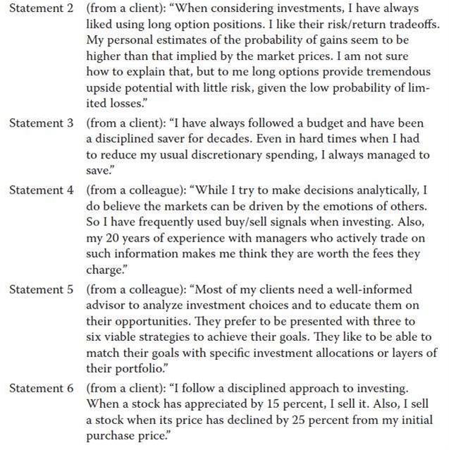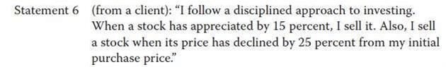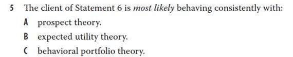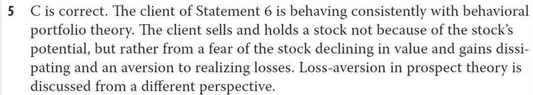 第7章课后题第5题。陈述6中客户遵循的是止盈点、止损点。选项A(前景理论)意味着客户是损失厌恶型,因此在发生损失的时候,客户反而会寄希望于股票反弹,而继续持有股票(risk seeking),因此不会设置止损点,这与陈述6相违背,因此选项A不正确。正确答案是选项C(行为投资组合理论,BPT)。BPT的核心思想就是投资分层,同时还涉及到心理账户、风险分层、缓解损失厌恶情绪等内容,然而我认为止盈点、止损点中并没有与BPT相关的内容。我选择了选项B,因为客户设置止盈点、止损点可能是希望能将自己的投资效用最大化。