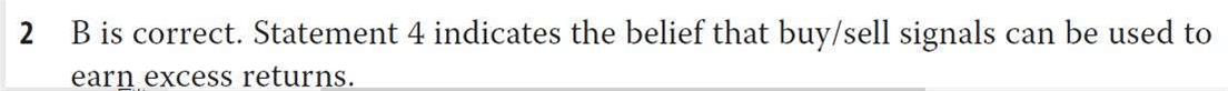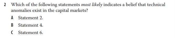 已回答第7章课后题第2题。之所以陈述6(选项C)不对(与技术异常性无关),是因为陈述6中叙述的内容是“止盈点/止损点”,而止盈点/止损点并非技术分析的结果,而只是投资者内心划定的一个分水岭。而选项B(陈述4)正确,是因为其用到了“买卖信号”这样的技术分析。这样理解是否正确呢?