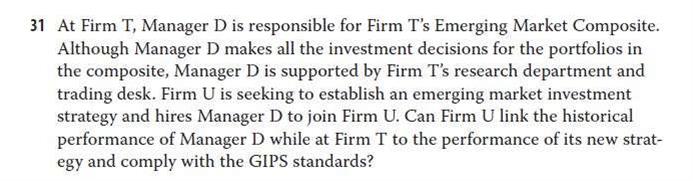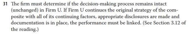 第6章课后题第31题。题目中谈到基金经理D从T公司跳槽到U公司,并询问U公司是否可将基金经理D在T公司时的投资业绩和在U公司时的投资业绩相链接。答案中称,只要基金经理D的投资策略不变,U公司做好相应的披露和记录留存工作,即可链接基金经理D跳槽前后的业绩。我感觉这和网课上所说的“企业完成收购之后是否可继续宣称遵循GIPS”的逻辑很类似。若宣称遵循GIPS的公司收购不遵守GIPS的公司,但被收购企业的(1)投资决策人员不变(2)投资决策流程不变(3)纪录保存,那么收购方就可以宣称自己依然遵守GIPS。在这里,基金经理依然是他/她本人,所以“投资决策人员不变”这点不用说就知道,而后两条就完全和“企业收购”部分类似。请问,将“基金经理跳槽之后业绩是否可与跳槽前链接”的判定标准与“企业完成收购之后是否可继续宣称遵循GIPS”的判定标准视为基于同一原理,这一逻辑是否可以成立呢?