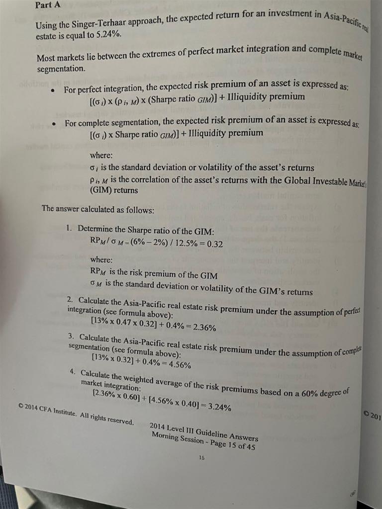请问Casebook的2014年CME的A题目,答案解析中把0.4%的illiquidity分别加入了fully integrated risk premium和fully segmwnted risk premium中,然后再加权平均,最后再加上risk free rate. 请问是否可以在计算两个risk premium时先不加0.4%,而是先加权平均,求出weighted risk premium,最后再加上risk free rate和illiquidity premium。虽然两种计算方法得出的结果是一样的,但是到底哪个是对的呢?
