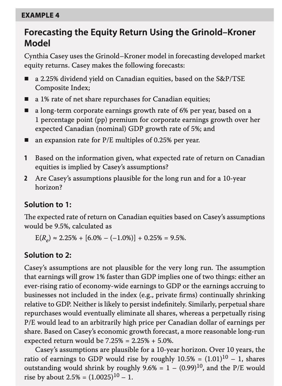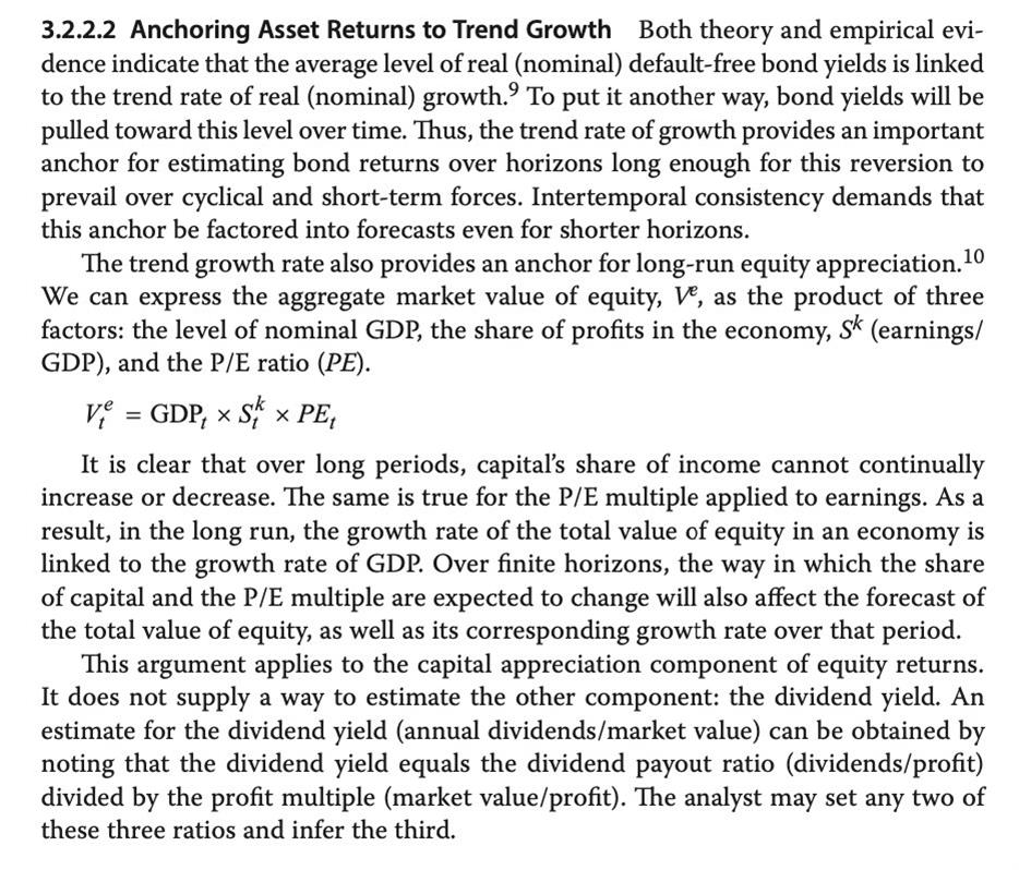 已回答老师,原版书184页在公式下面有一段话,不明白这段话想要表达的知识点在哪里? This argument applies to the capital appreciation component of equity returns. It does not supply a way to estimate the other component: the dividend yield. An estimate for the dividend yield (annual dividends/market value) can be obtained by noting that the dividend yield equals the dividend payout ratio (dividends/profit) divided by the profit multiple (market value/profit). The analyst may set any two of these three ratios and infer the third.