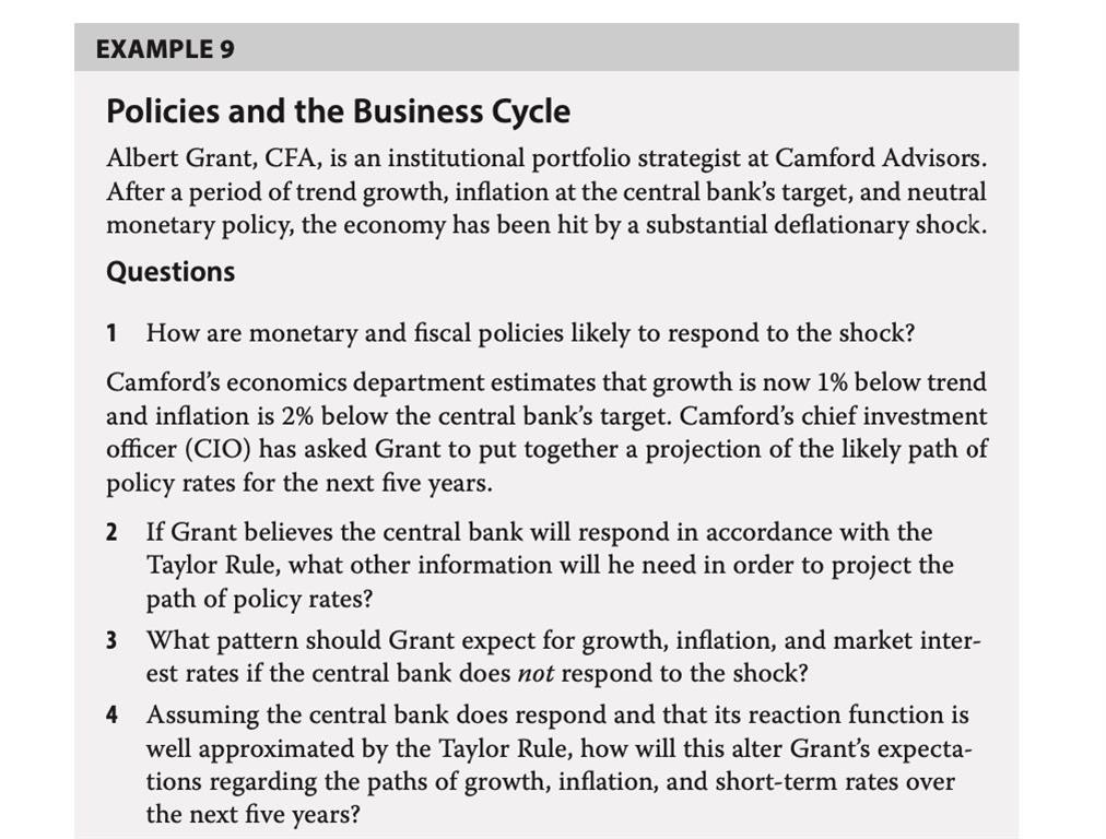 在原版书的第199页的example 9: (1)第二问,问还需要哪些数据,答案说了很多数据,但是题目已经告诉我们, growth is now 1% below trend and inflation is 2% below the central bank’s target,那这样不就是知道了公式中的两个0.5 括号里面的了吗?那只需要中性利率和预期的通货膨胀不就可以计算出预期的利率了吗? (2)第四问,问如果政府干预和不干预相比,增长率和通胀率会下降更快,这个结论是如何得到的。我的理解是如果政府干预,会继续降低短期利率,但是对增长率和通胀的影响该如何判断?