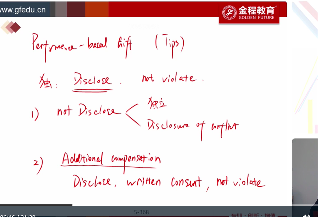 performence-based gift 和 additional compensation到底有什么区别啊?这两个不都是因为我业绩好所以客户送给我一个小礼物吗?那如果我接受了并且disclose了,到底算不算违规呢?这一页板书括号1说不违规,括号2又说违规,所以performence-based gift 和 additional compensation的区别是有没有事先征得书面同意吗?