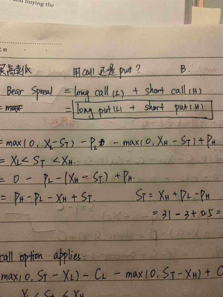 课后题第六题,对于bear spread的计算,记忆点是买高卖低。题目没有指定用put还是用call,理论上两种方式都可以吧,那计算出的答案应该是两个。用put option的答案才是28.5。 原版书直接用put来计算,是否是用put在实物中更多?