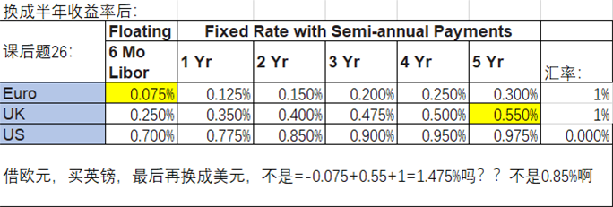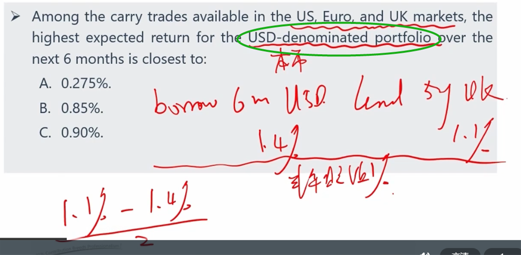 已回答老师好,这题目我是百思不得其解。它不是说USD-denominated portfolio ,那么最后的结果不是要全部换成美元吗,而欧元和英镑都是升值1%,欧元对英镑不变;那么借欧元,买英镑,最后再换成美元,不是=-0.075+0.55+1=1.475%吗??不是0.85%啊。它最后不用换成美元?
