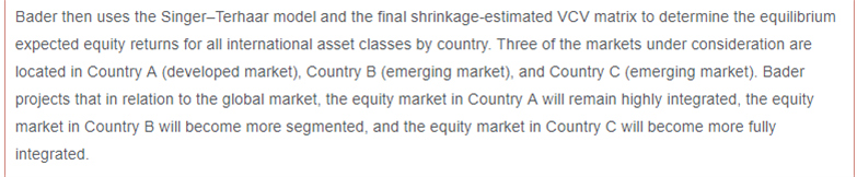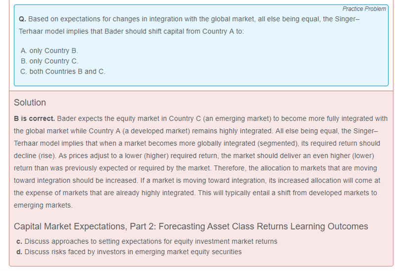 已回答請問這題有關於Singer–Terhaar model,答案為什麼是countryC, 一個國家有高一點的risk premium不是代表比較高的回報嗎? 解答中"As prices adjust to a lower (higher) required return, the market should deliver an even higher (lower) return than was previously expected or required by the market. "這段話我不是很理解,非常感謝。