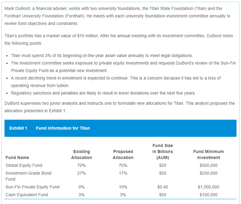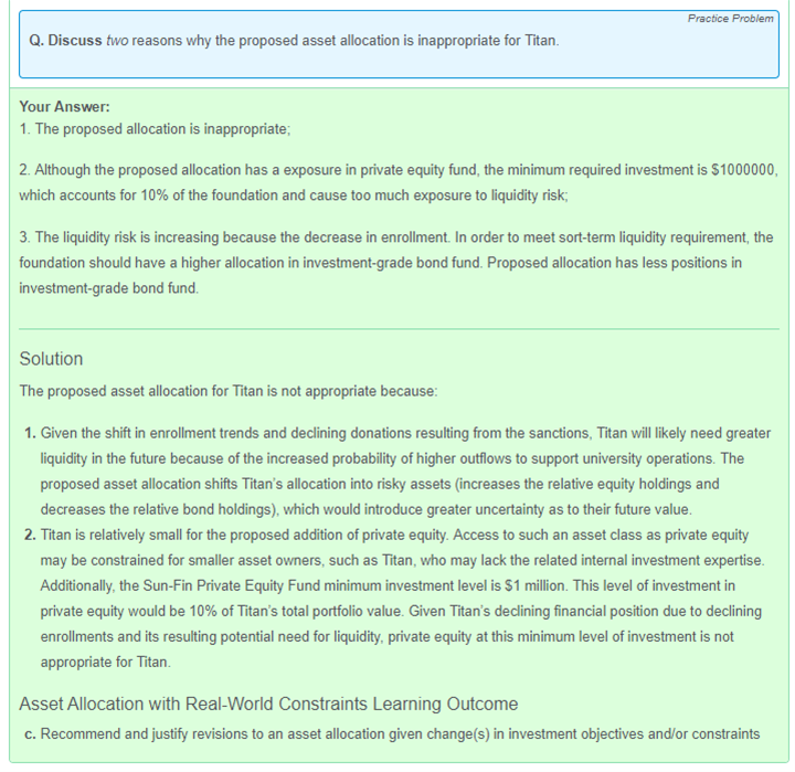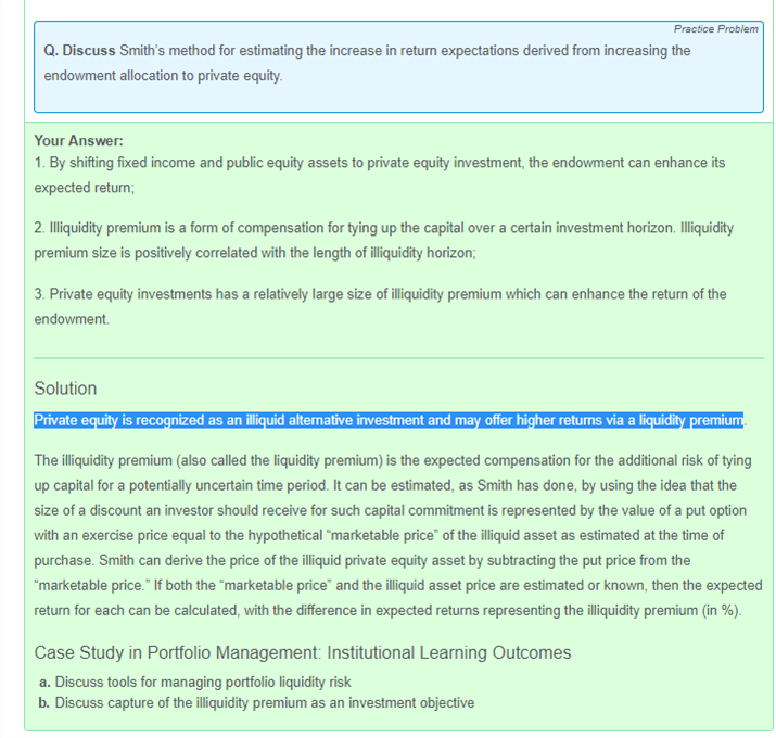 想請問asset allocation 跟 required rate of return,liquidity requirement, time horizon 之間的關係。在這個題目中說 foundation 的支出要提高然後donation 會減少,所以liquidity requirement 也提高,所以應該要投資 investment-grade bond fund。 我記得在reading 38 case 中,因為有關於提高 endowment 或是 foundation的spending requirement 的時候是建議投資illiquid assets因為liquidty premium,但是在asset allocation 章節的講法好像是相反的。 所以我的問題是關於asset allocation 章節裡的 spending requirement 增加liqudity requirement 增加,所以要投liquid assets,但是在reading 38 就是反過來 endowment spending 增加但是要投illiquid assets來增加回報?