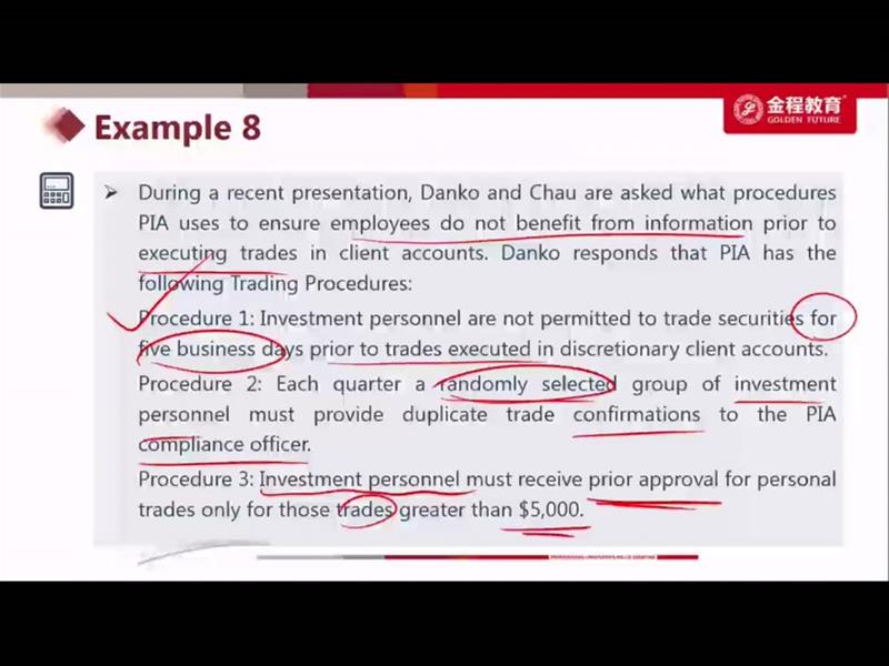 这里老师说错了吧,这里是在客户交易之前的5天不能自己交易? 另外,只限制不能在客户之前交易好像也有问题,如果manager在客户交易之后马上自己交易,也违规吧,所以这里没有规定客户交易完之后多久可以自己交易,这第一条也有漏洞吧?