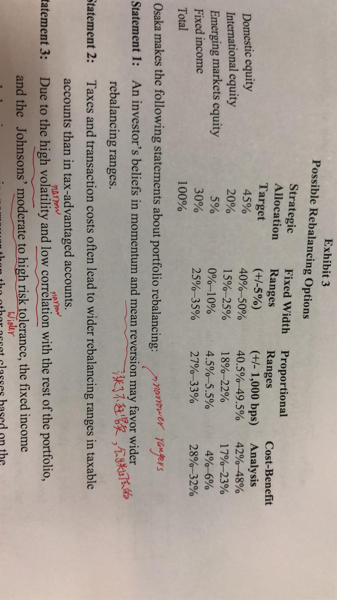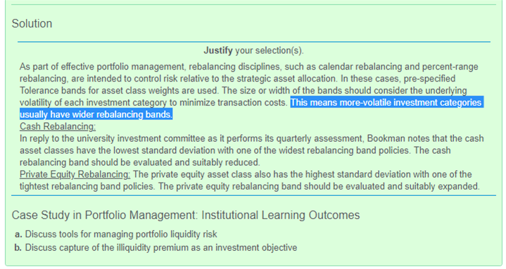 想請問基於Asset allocation reading,一個asset的volatility越大,the rebalance range 應該要越小,但是這邊卻是說,"The size or width of the bands should consider the underlying volatility of each investment category to minimize transaction costs. This means more-volatile investment categories usually have wider rebalancing bands." 請問rebakance ranger 應是越大還是越小?