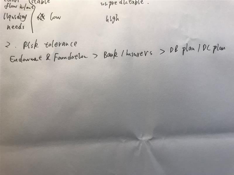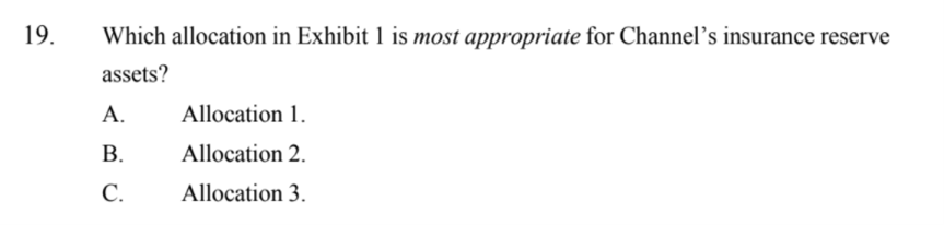 想請問一個觀念上的問題,mock3 Q19。我記得歷屆考題有考過 casualty insurance 的 liabilities 是 timing and amount of cash flows are uncertain,所以需要的投資金額很大並且投資期限很短。基於這個想法我選allocation 3,因為equity 跟 cash 的比例較高,而且流動性較好,但是答案是allocation1。 我想問說以後 casualty insurance 題目應該是把它當作一般的insurance公司,然後主要注意在匹配liabilities上嗎?