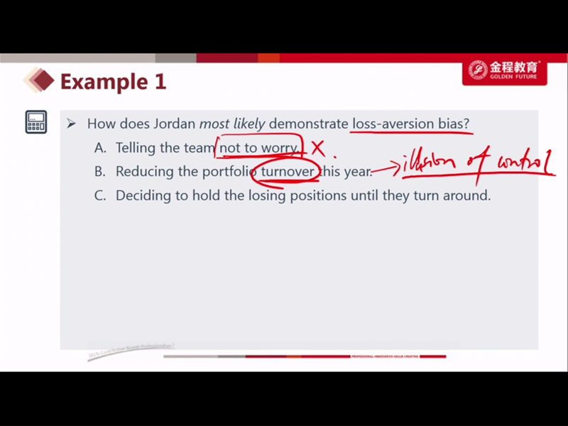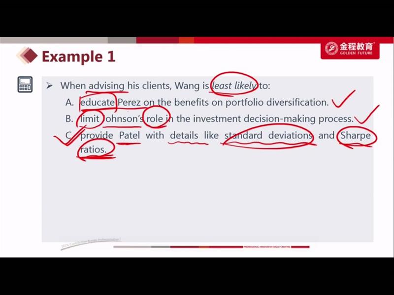 这道题可以理解为在考投资者的四种分类方法么,其中Patel是一个愿意向他认为更有知识的人请教的人,不是FF么,而对于FF是可以用一些量化的方法去沟通的 而Johnson,虽然从描述中不能确定他是AA还是II,但总体算更偏激进的AA一些,那对于AA,不limit他的role in investment ,也不算错吧(因为人家可能比较有主见些)