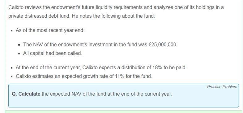 已回答见附件图片,这是协会网上一道题。 我不太明白为什么最后Expected NAV = [(€25,000,000 × 1.11) + 0 − €4,995,000] × 1.11 = €25,258,050. 怎么把1.11乘以了两遍?