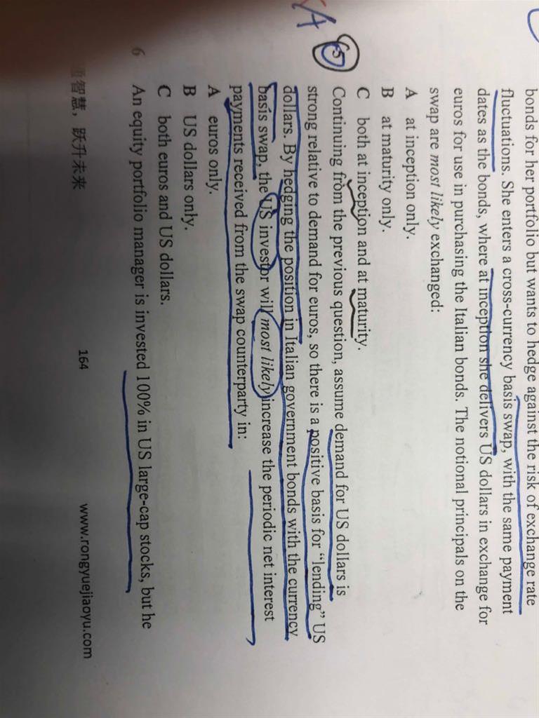 本题描述的是cross currency basis swap,但是一直没有get到这个知识点关注的点,请问下老师他的意思是美国投资者在美国借了一笔钱,通过本金互换给到欧洲人,欧洲人到期将本息一起以美金形式还给美国人,而且是以net形式,那么既然是net形式,可否理解为做本金换的,为了借美元投资,本金不换的,其实为了套利?既然不管换不换本金都是给net的美元,为啥还有这个区分呢?还有想请问下这个知识点需要掌握到啥程度,感觉老师上课说的是掌握概念