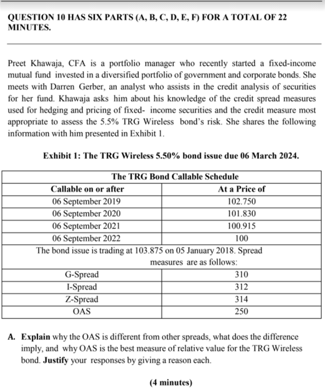 請問mock1-Q10-A,我這樣寫是否足夠? 1. OAS is appropriate to measure yields of options embedded bonds, unlike other spreads, such as G-spread, I-spread, and Z-spread; 2. OAS = Z-spread - option costs. The difference comes from option costs; 3. OAS is appropriate to measure the yield of TRG bonds because they are callable bonds. Other spreads, such as z-spread doesn't fully account for the characteristics of callable bonds.