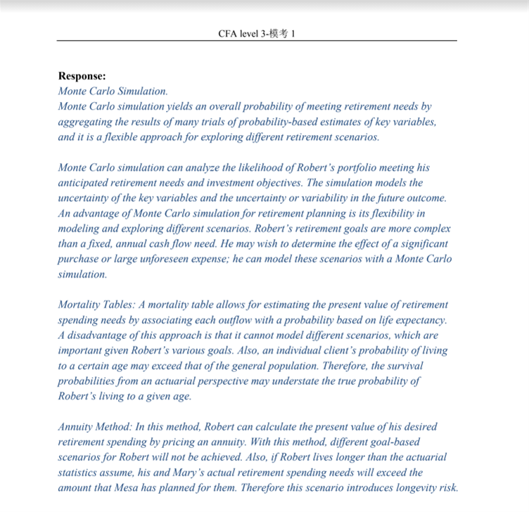 請問mock 1 Q2 B i and ii,這樣回答可以嗎? Robert should use the Monte Carlo simulation. 1. Monte Carlo simulation provides a possibility of distribution, a multiperiod estimation, and a path-dependent terminal value, which is suitable for Robert to estimate the possibility of achieving to fund his wife’s spending needs. 2. Mortality table can calculate PV of spending needs based on outflows and life expectancy. However, if the statistical assumptions are not held, the investor faces the risk of the insufficient fund; 3. Annuity method can calculate the PV of future spending needs for a given period of time. However, if the statistical assumptions are held, the investor faces longevity risk.