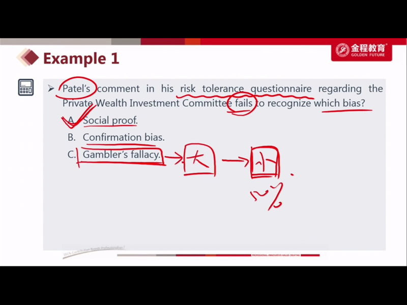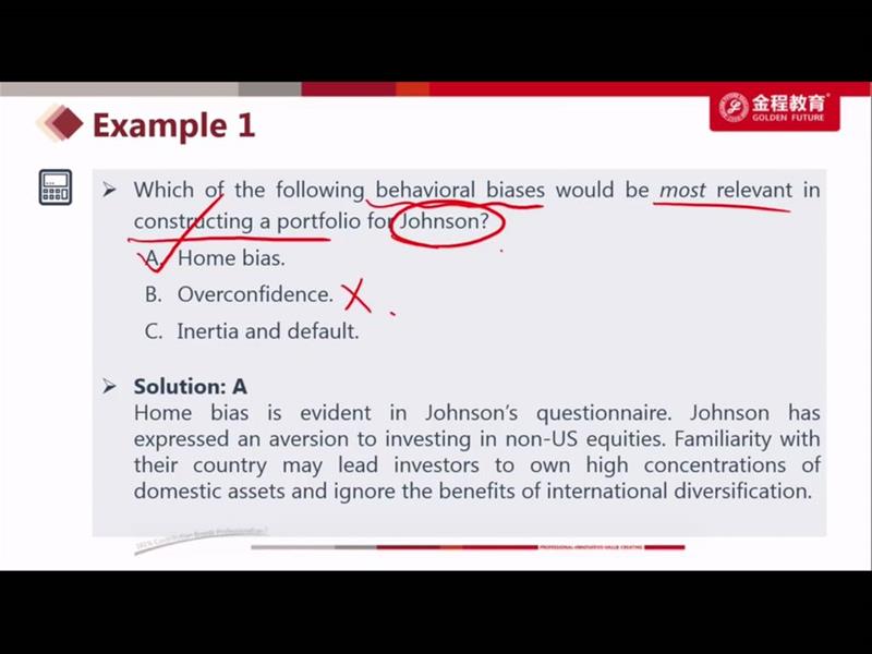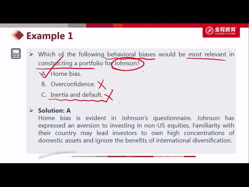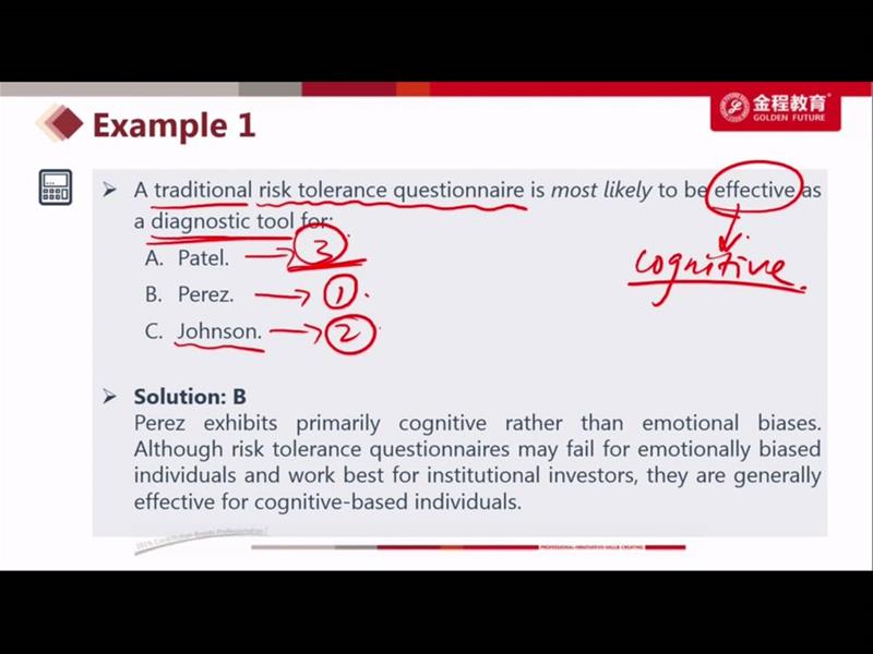 这道题可以理解为在考投资者的四种分类方法么,其中Patel是一个愿意向他认为更有知识的人请教的人,不是FF么,而对于FF是可以用一些量化的方法去沟通的 而Johnson,虽然从描述中不能确定他是AA还是II,但总体算更偏激进的AA一些,那对于AA,不limit他的role in investment ,也不算错吧(因为人家可能比较有主见些)