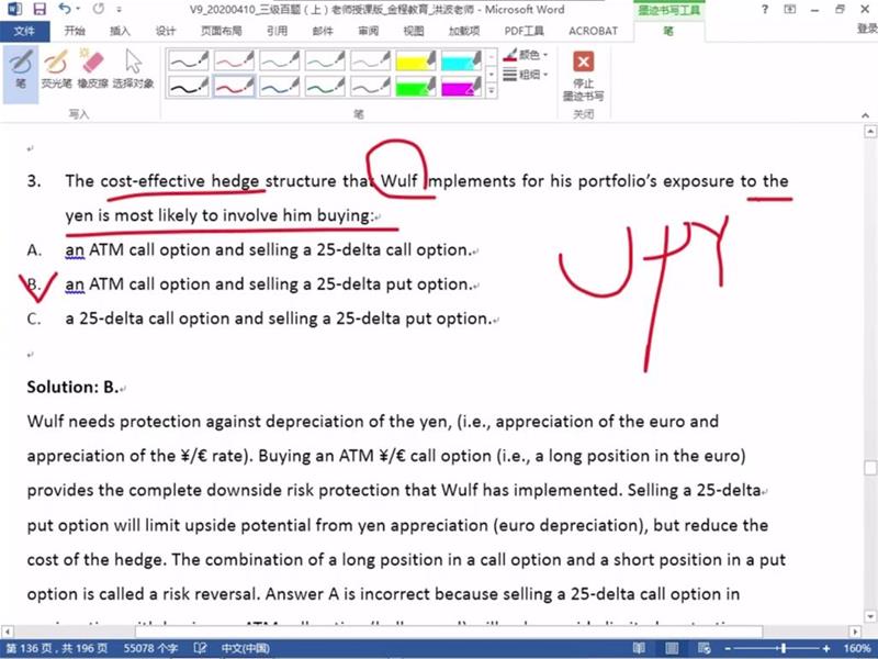 R16第4/5题, 时间长了有点忘了哈, 所以请教一下老师. 这两道题里其实是说, US投资者想投意大利的EUR国债, 但是不想换€, 所以就进入了cross-currency basis swap(意大利投资者把EUR借给US投资者买国债, 他把美元借给意大利投资者); 然后第5题说了关于positive cost basis的问题, 这里是$换€的cost basis为正, 也就是US投资者有正收益, 所以就是这个投资者在swap结束的时候, 收回他借出的$时有收益; 而之所以不选A的原因, 是因为€和$是没法net结算的, 也就是说哪方有正收益只有在收回各自借出的款项时才能知道. 您看我的理解正确吗?