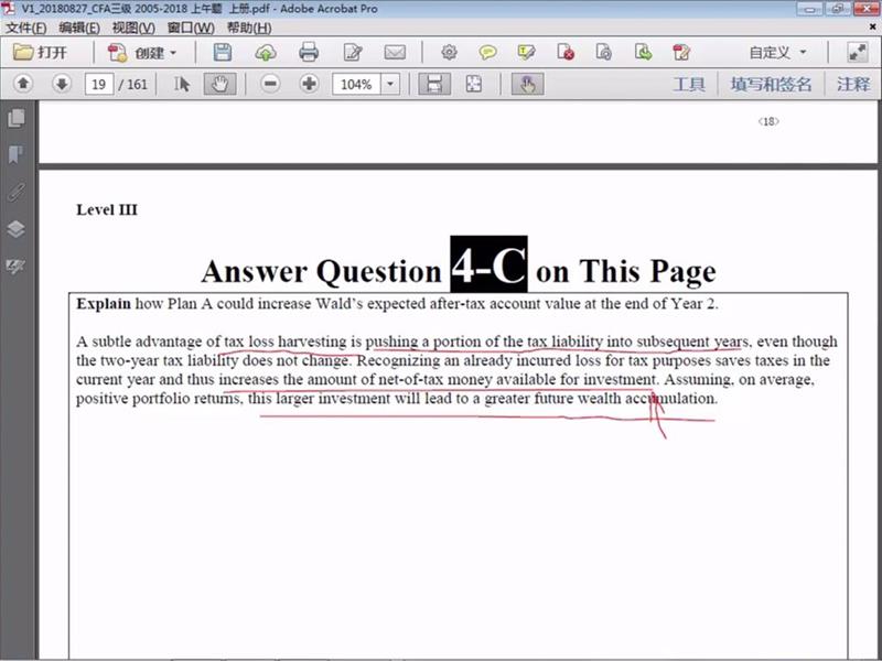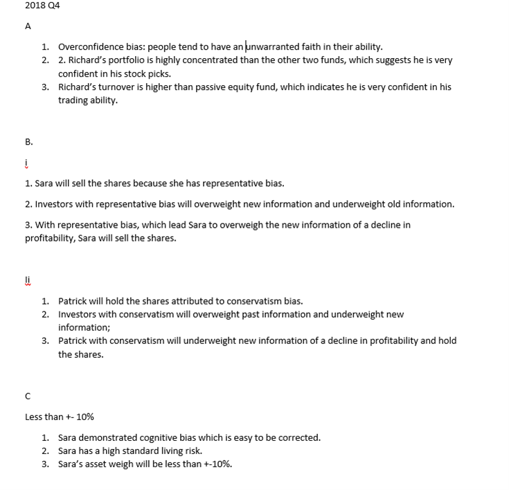 已回答請問2018 – Q3 Institutional ABC這樣寫可以嗎? A. Spending requirement = nominal return – inflation rate – management fee = 7 – 1.5% - 0.33% = 5.17% B. i. low ability to take risk 1. The foundation will not receive a donation which indicates no cushion to absorb investment losses; 2. The foundation solely sponsors local youth center, which will limit the ability of the foundation to take a risk; ii. High ability to take risk 1. The foundation is operating perpetual, which allows the foundation to absorb short-term investment losses; 2. There are no debt-like liabilities, which suggests the foundation might skip the spending. C. 1. The cash reserve will be higher because of increases in the uncertainty of cash outflow; 2. The changes in the spending rule will cause a higher liquidity requirement because the average monthly asset value is more volatile than the asset value at the beginning of a year.