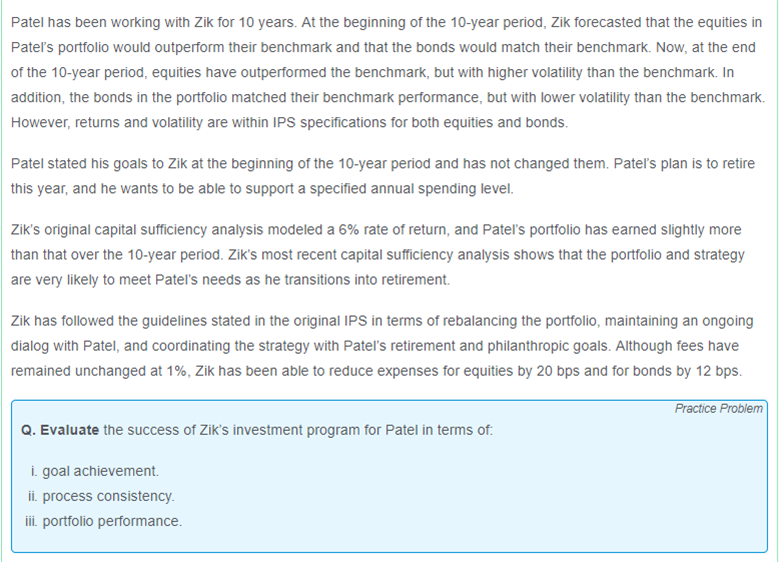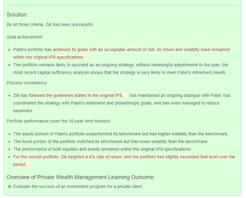 請問有關於這題goal achievement, process consistency, and portfolio performance 這樣寫可以嗎? goal achievement. 1. The manager is successful to achieve the goal because the portfolio achieved a better-than-expected return with an acceptable level of risk; 2. According the capital sufficiency analysis, the portfolio is likely to meet the client’s need. process consistency. 1. The portfolio has consistently delivered a desired result over the investment horizon, which suggests the manager achieved the goal based on the skills; 2. The manager followed the investment guideline stated in the IPS in terms of rebalancing the portfolio and communicating with the client. portfolio performance. 1. The portfolio delivered a better-than-expected result because the return is higher than the target and the expenses are reduced.