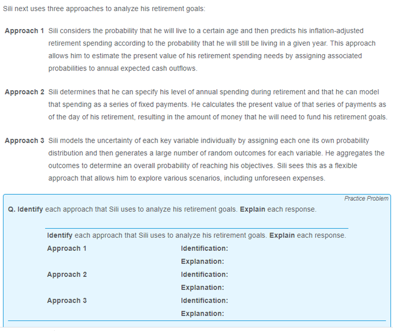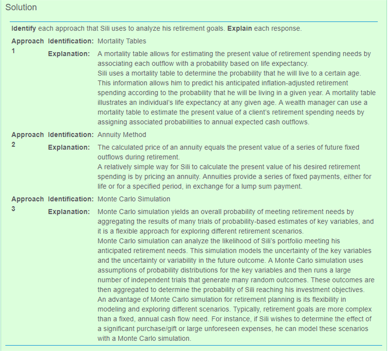 請問這題這樣寫是否足夠 Approach 1: the approach that Sili takes is mortality table. The mortality table approach is to take the probability of living and spending needs into account at the same time. According to the approach that sili used, he estimate the probability of living and the PV of retirement spending needs which matches the description of mortality table approach; Approach 2: the approach that Sili uses is annuity pricing. The pricing strategy is to estimate the expected spending need and derive the amount of capital needed. The approach Sili used is to estimate the PV of payments after the retirement, which matches the description of annuity pricing approach; Approach 3: the approach that Sili uses is Monte Carlo simulation. The simulation is to estimate the probability of distribution of possible results. The approach used by Sili is to models the uncertainty of each key variable individually by assigning each one its own probability distribution and obtains a large number of rand