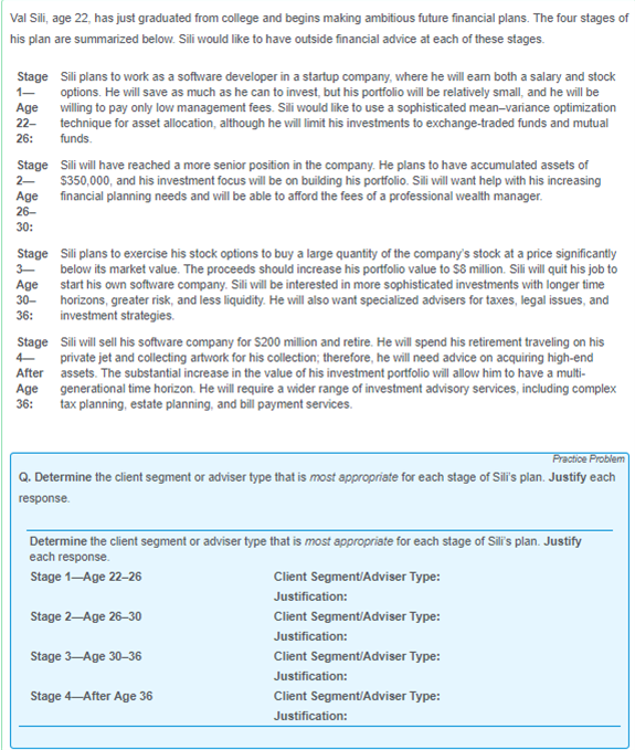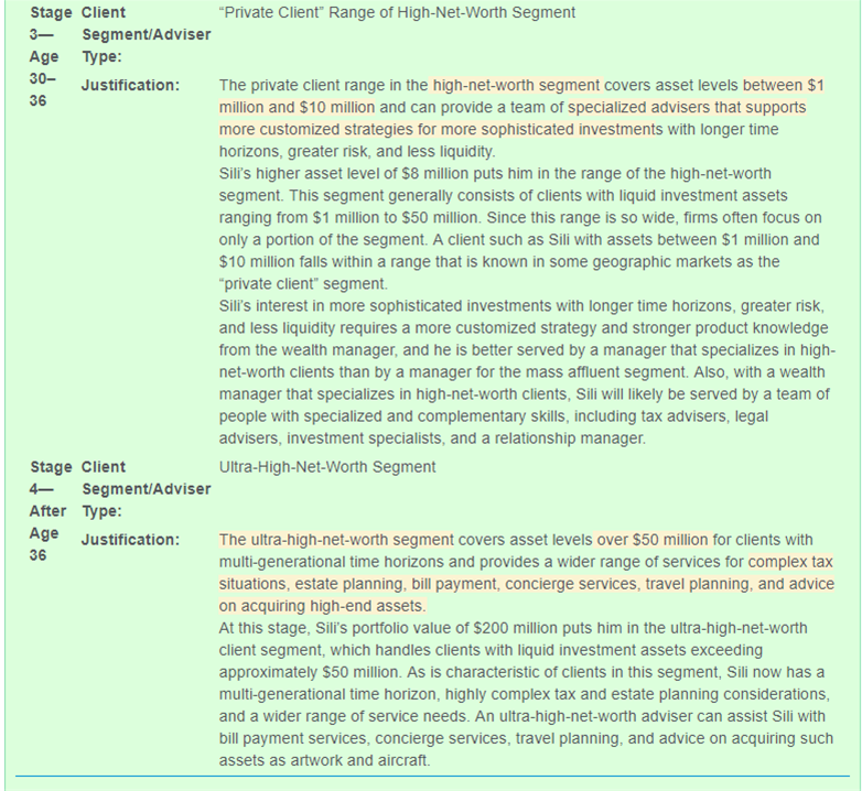 請問這題這樣寫是否足夠? Determine the client segment or adviser type that is most appropriate for each stage of Sili’s plan. Justify each response. 1. Stage 1: this stage belongs to robot-advisor. The client’s asset value is below $250,000 level and the client construct his portfolio with ETFs, Mutual funds, and low-cost alternatives; 2. Stage 2: this stage is a mass affluent segment. The client’s asset is between $250,000 to $1mn and the client starts having a need for financial plans; 3. Stage 3: this is stage is a high-net-worth client. The client’s asset is between $1mn to $10mn and the client has specific financial services; 4. Stage 4: this stage is ultra-high-net-worth. The client’s asset is above $50mn and the client has needs for highly customized financial services.