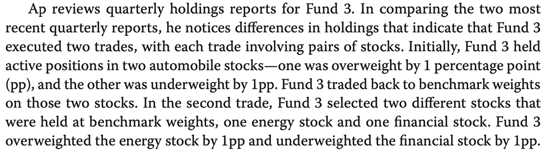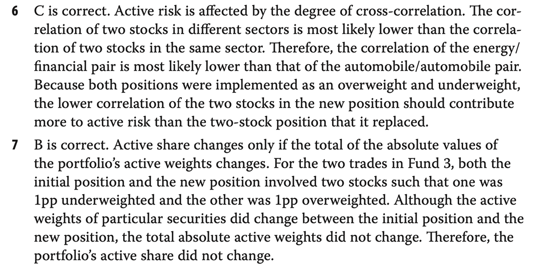 Reading25的课后题里,第六题可以理解为第一笔交易中两支股票权重的改变不会影响active risk吗? 第7题答案里说Although the active weights of particular securities did change between the initial position and the new position, the total absolute active weights did not change. 这个不是active share减少了1%吗